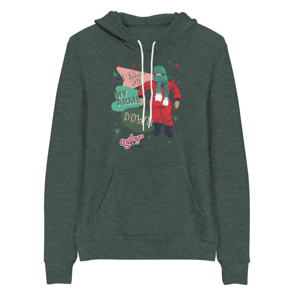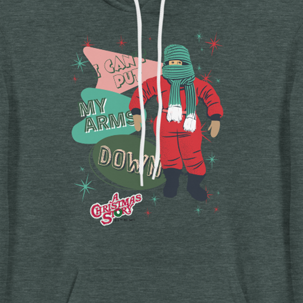 You'll be able to lounge freely with the A Christmas Story Can't Put My Arms Down Hooded Sweatshirt. This warm and snuggly sweatshirt features Randy's iconic scene from A Christmas Story that will be your favorite new holiday hoodie.