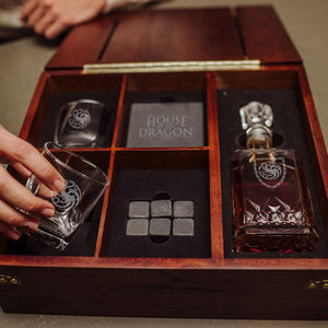 If you've been looking for the perfect drinkware set, then look no further! Introducing the House of the Dragon Decanter Set. The chest is crafted out of beautiful oak and fastened with pounded nails. The hollowed area in the box can fit a standard 750mL bottle of your favorite drink. This gorgeous chest securely displays its contents, and the soapstone drink stones will chill your drink without fear of diluting it. Don't miss out on the perfect gift for the Game of Thrones fan in your life, whether it's a birthday, graduation, or wedding. This will not disappoint. Includes: