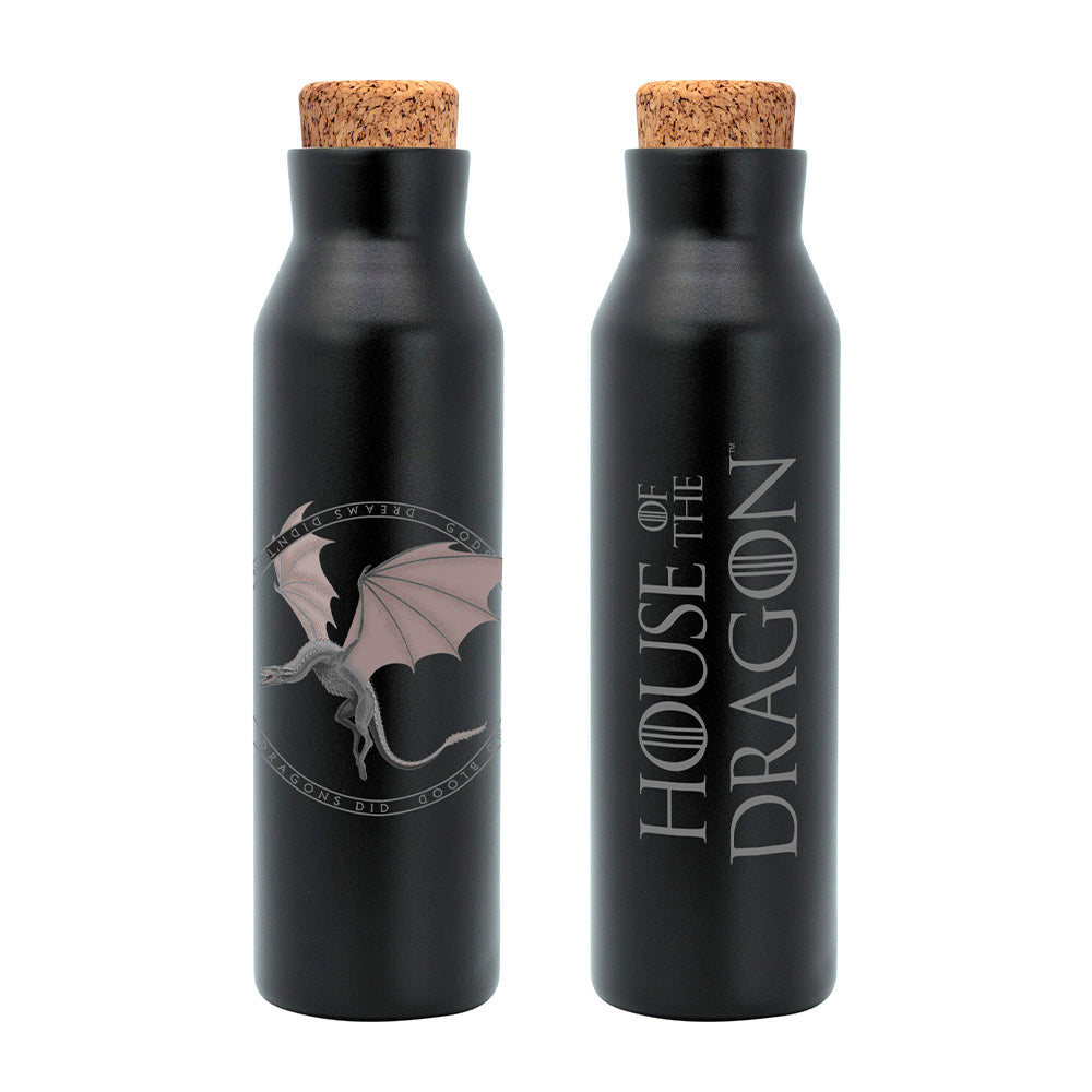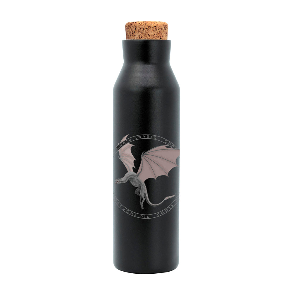 Stay hydrated with the new Stainless Steel Thermal Water Bottle from House of the Dragon. Featuring the Dreams didn't make us kings, Dragons Did quote surrounding Syrax. Made of Stainless Steel with a cork print screw on top.