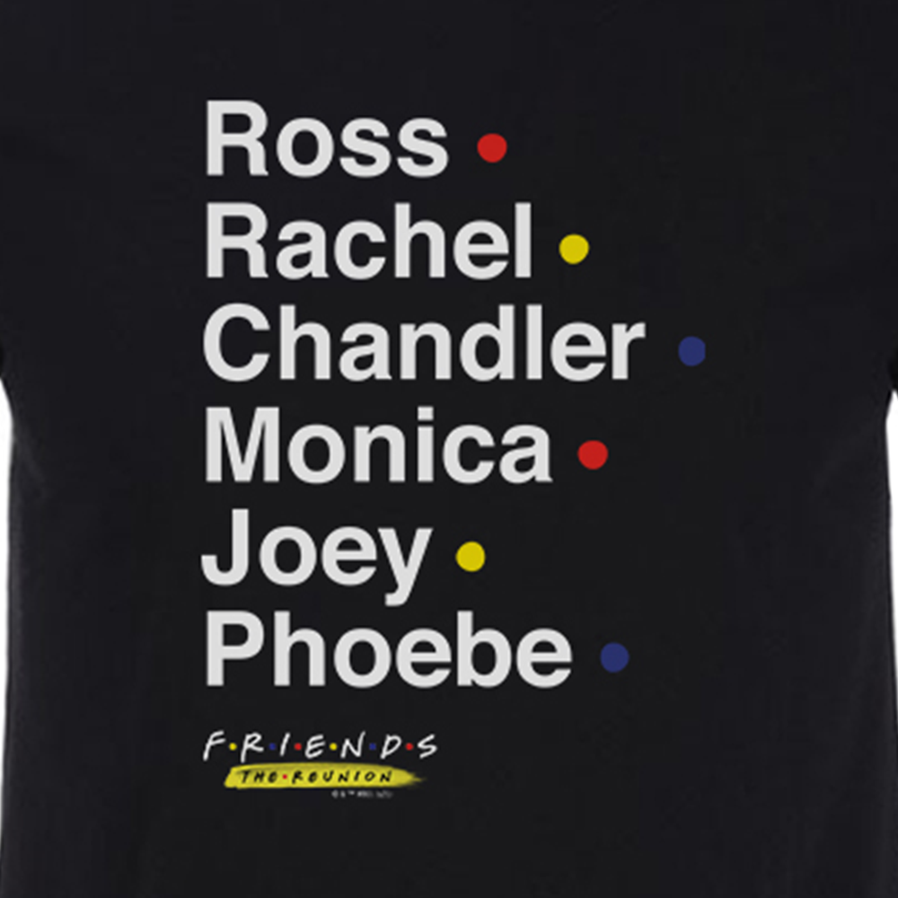 Get ready for “The One Where They Get Back Together” with this Friends Reunion Names Adult Short Sleeve T-Shirt. Featuring Ross, Rachel, Chandler, Monica, Joey, and Phoebe within the iconic yellow frame, this Friends reunion t-shirt lets you celebrate the special episode in style.