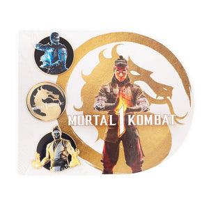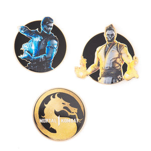 The bundle includes pins of the iconic dragon logo with Mortal Kombat 1 across it and Lin Kuei members Scorpion and Sub-Zero.