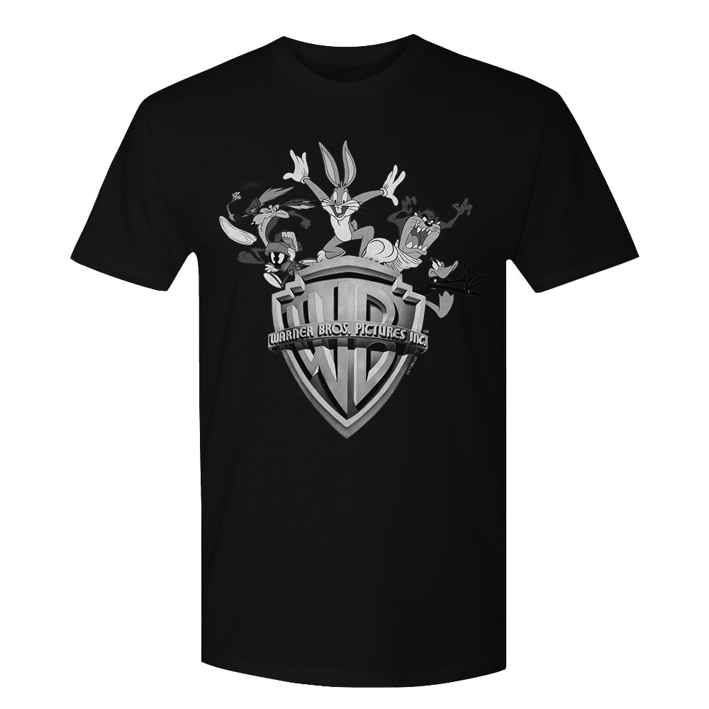 Show your love for Looney Tunes and Warner Bros. with this WB 100 Warner Bros. Shield Looney Tunes Black & White Adult Short Sleeve T-Shirt. Featuring your favorite Looney Tunes and the Warner Bros. Shield, this comfortable Looney Tunes t-shirt is the perfect way to celebrate Warner Bros. 100th Anniversary.