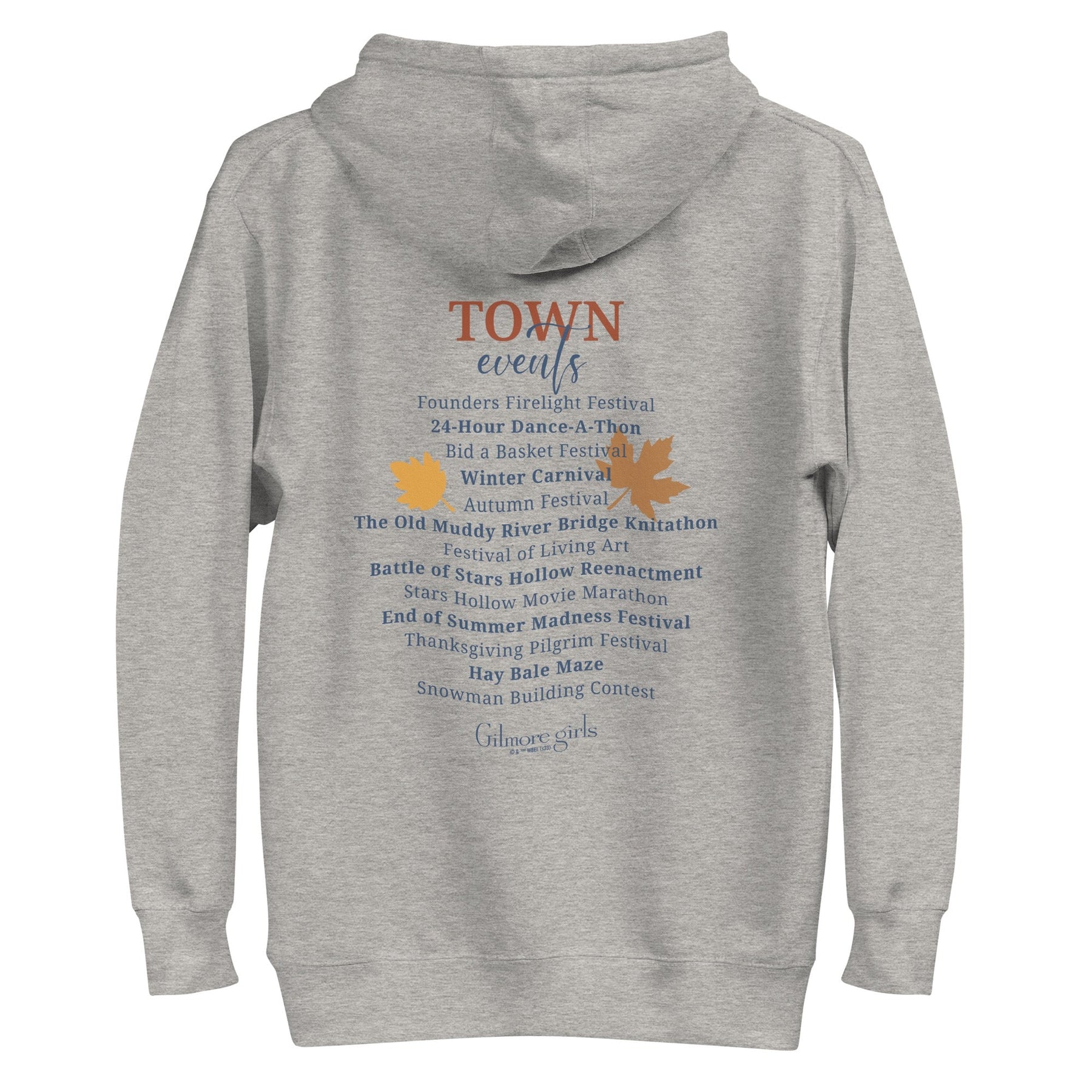 Step into the charming world of Stars Hollow with the Gilmore Girls Town Events Hoodie. Whether you're reminiscing about the quirky happenings in Stars Hollow or looking to showcase your love for the Gilmore Girls, this T-shirt is a comfortable and stylish addition to your wardrobe that will transport you right back to the heartwarming town.