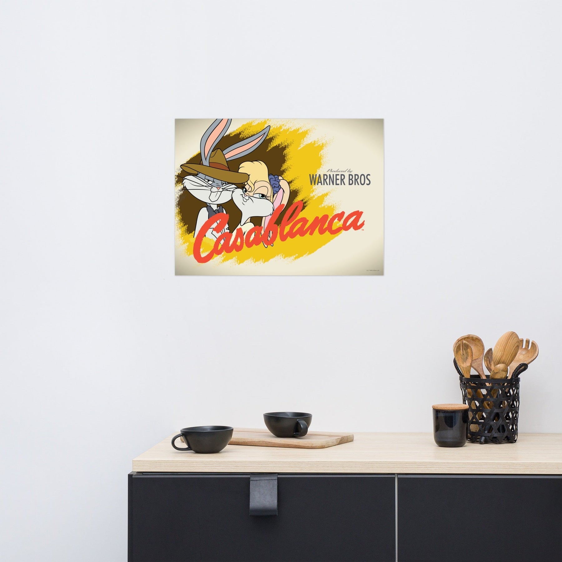 This WB 100 Looney Tunes x Casablanca Premium Satin Poster is the perfect addition to your media room, office, dorm room, and more. Featuring Bugs Bunny and Lola as Rick and Ilsa, this poster will be recognized by any fan of Looney Tunes or Casablanca. Frame this poster or leave it as-is to show off how much you love Warner Bros.